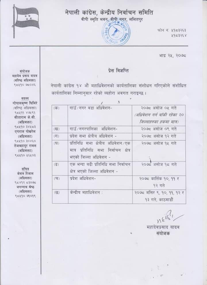 तर, प्रदेशको अधिवेशन भने कात्तिक १० देखि १२ सम्म गरिने पुरानो कार्यतालिका यथावत गरिएको छ भने मंसिर ९ देखि १३ सम्म तय भएको महाधिवेशनको मिति पनि तत्काल परिवर्तन गरिएको छ ।