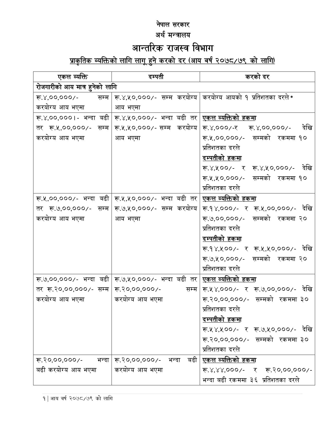 त्यसैगरी व्यक्तिगततर्फ चारदेखि पाँच लाखसम्म चार हजार र १० प्रतिशतका दरले लागु हुने उल्लेख छ । दम्पतीतर्फ साढे चारदेखि साढे पाँच लाखसम्म करयोग्य आय भएमा चार हजार पाँच सय र १० प्रतिशत कर लाग्ने उल्लेख छ ।