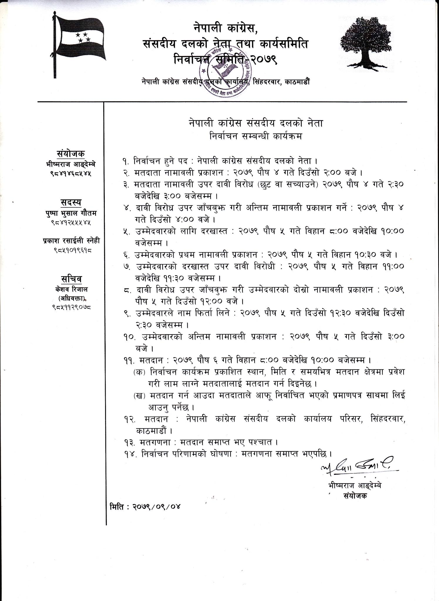 ९. उम्मेदवारले नाम फिर्ता लिने : २०७९ पौष ५ गते दिउँसो १२ः३० वजेदेखि दिउँसो २ः३० वजेसम्म ।