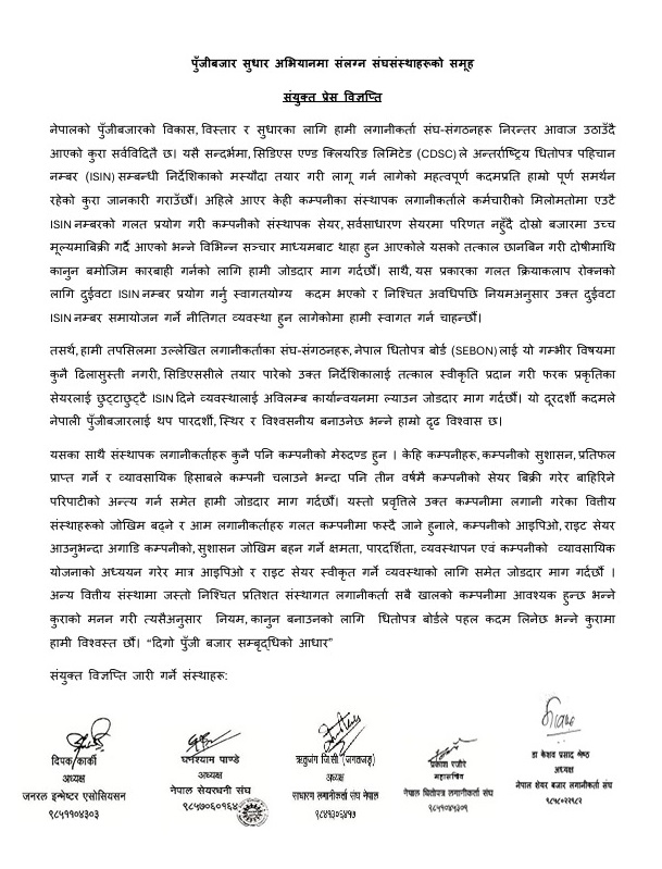 विज्ञप्तिमा भनिएको छ, ‘संस्थापक सेयर बिक्रीमा देखिएको विकृति गम्भीर छ, यसको तत्काल छानबिन गरी दोषीमाथि कानुनी कारबाही हुनुपर्छ।’