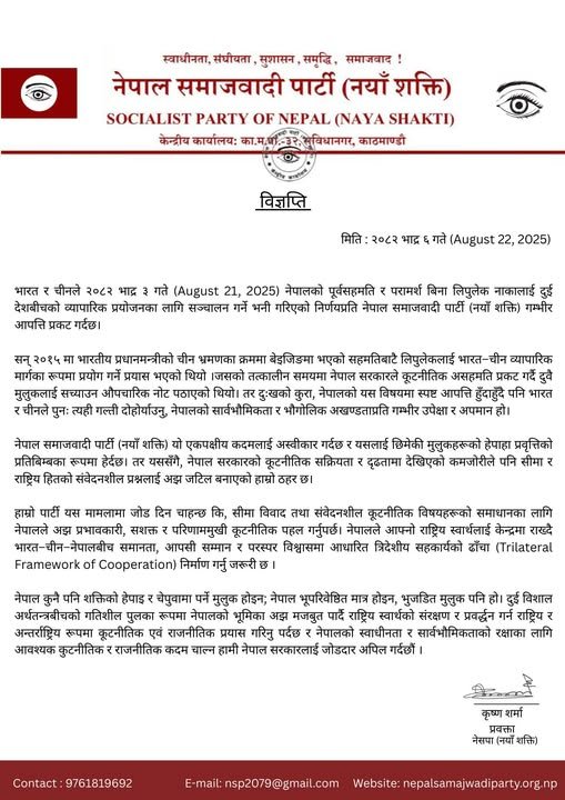 काठमाडाैं, ६ भदाै । नेपाल समाजवादी पार्टी (नयाँ शक्ति)ले नेपालको पूर्वसहमतिबिना भारत र चीनले व्यापारिक प्रयोजनका लागि लिपुलेक नाका सञ्चालन गर्ने सम्झौता गरेकोमा गम्भीर आपत्ति जनाएको छ। पार्टीले शुक्रबार विज्ञप्ति जारी गर्दै यो कदम नेपालको सार्वभौमिकता र भौगोलिक अखण्डतामाथिको गम्भीर उपेक्षा भएको बताएको छ।
