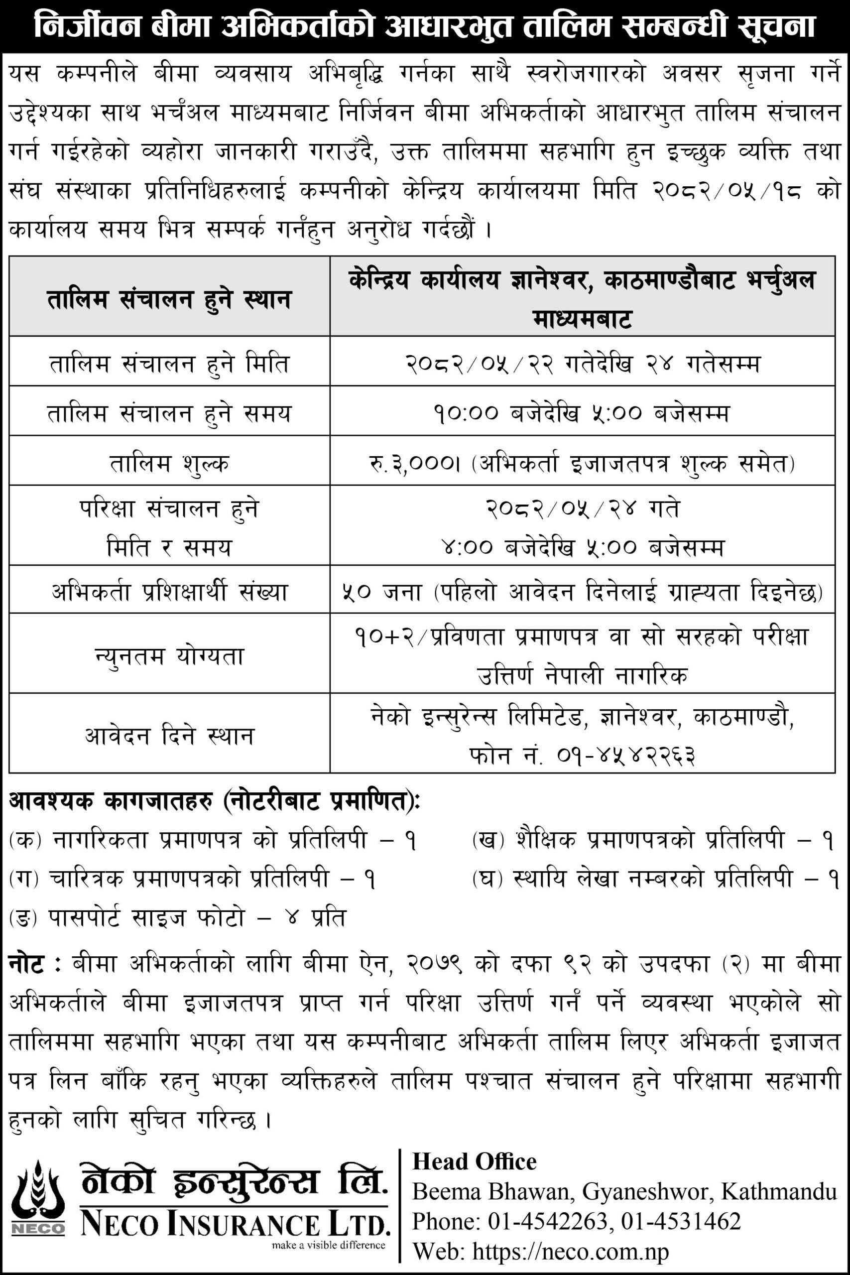 काठमाडाैं, ९ भदाै । नेको इन्स्योरेन्स लिमिटेडले निर्जीवन बीमा क्षेत्रका लागि नयाँ अभिकर्ता तालिम सञ्चालन गर्ने भएको छ। कम्पनीले एक सार्वजनिक सूचना जारी गर्दै भदौ २२ गतेदेखि २४ गतेसम्म उक्त तालिम सञ्चालन गर्ने जानकारी दिएको हो।