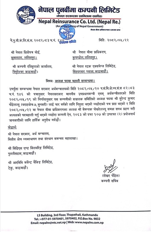 नेपाल पुनर्बीमा कम्पनीको अध्यक्षमा सुरेन्द्र कुमार पौडेल नियुक्त