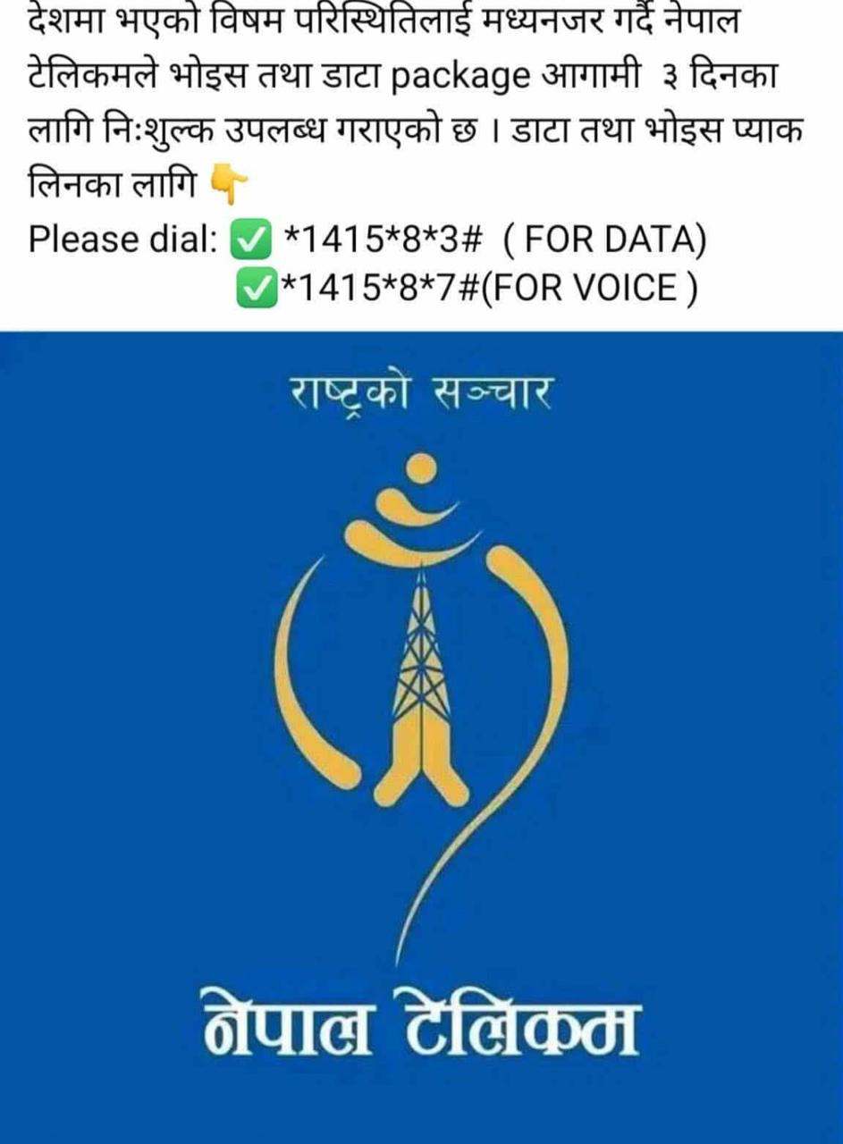 काठमाडाैं, २५ भदाै । नेपाल टेलिकमले देशभरको विषम परिस्थितिलाई ध्यानमा राख्दै तीन दिनका लागि निःशुल्क डेटा र भ्वाइस सेवा उपलब्ध गराएको छ। यो सेवा मंगलबारदेखि नै सुरु भएको हो।
