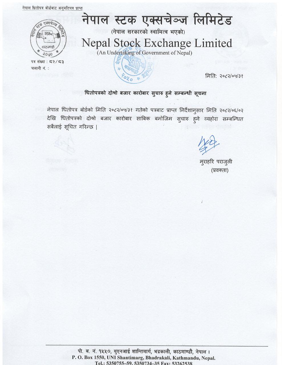 जनजीवन सामान्य अवस्थामा फर्किएपछि पनि सेयर बजार खुल्ने वा नखुल्ने भन्ने अन्योल थियो। तर, नेपाल धितोपत्र बोर्डले नेप्सेलाई कारोबार सुचारु गर्न निर्देशन दिएको थियो। सोही निर्देशनबमोजिम अब दोस्रो बजार कारोबार नियमित हुने भएको छ।
