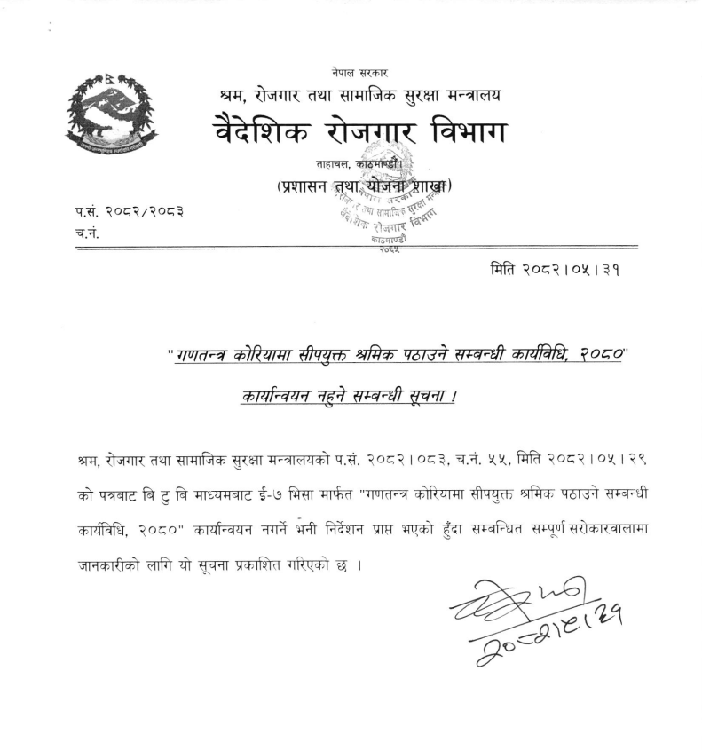काठमाडाैं, १ असाेज । सरकारले अब ई-७ भिसा प्रणालीमार्फत नेपाली कामदारलाई दक्षिण कोरिया नपठाउने भएको छ। यसअघि सीपयुक्त श्रमिक पठाउने भन्दै सुरु गरिएको ‘कोरियामा सीपयुक्त श्रमिक पठाउने सम्बन्धी कार्यविधि, २०८०’ लाई श्रम, रोजगार तथा सामाजिक सुरक्षा मन्त्रालयले कार्यान्वयन नगर्न निर्देशन दिएको छ।