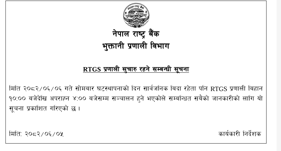 नेपाल राष्ट्र बैंकले जारी गरेको सूचनाअनुसार, अत्यावश्यक भुक्तानीहरूलाई सहज बनाउन आरटीजीएस प्रणाली आज सोमबार बिहान १० बजेदेखि दिउँसो ४ बजेसम्म खुला रहनेछ।