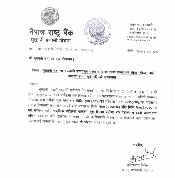 काठमाडाैं, १० असाेज । नेपाल राष्ट्र बैंकले दशैँ–तिहार जस्ता ठूला चाडपर्वलाई लक्षित गर्दै मोबाइल वालेटबाट गर्न पाइने दैनिक कारोबार सङ्ख्याको सीमामा वृद्धि गरेको छ।