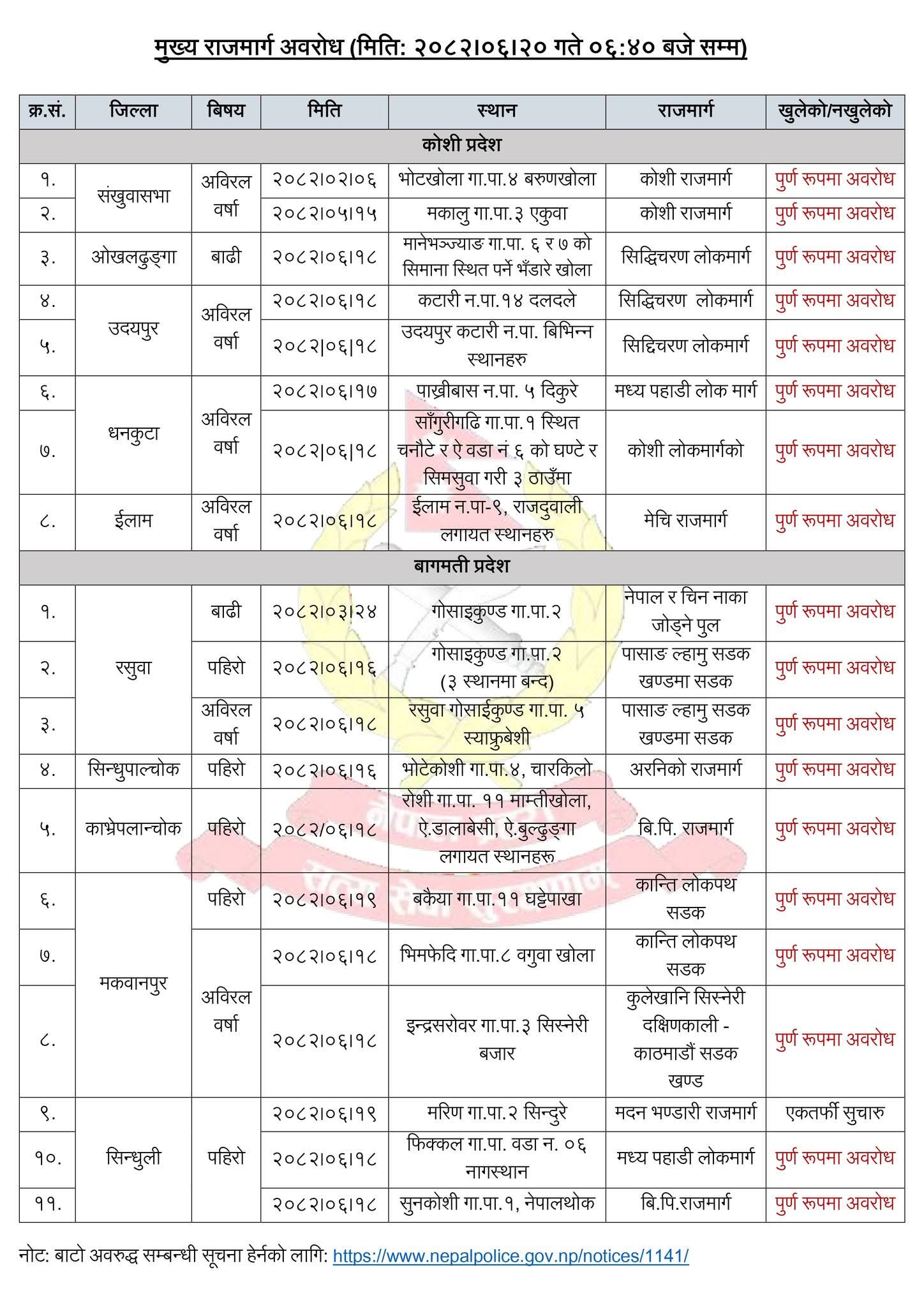 नेपाल प्रहरीले आज बिहान सार्वजनिक गरेको विवरणअनुसार, कोशी राजमार्ग, कान्ती लोकपथ लगायत प्रमुख राजमार्गहरू पूर्णरूपमा अवरुद्ध छन्।