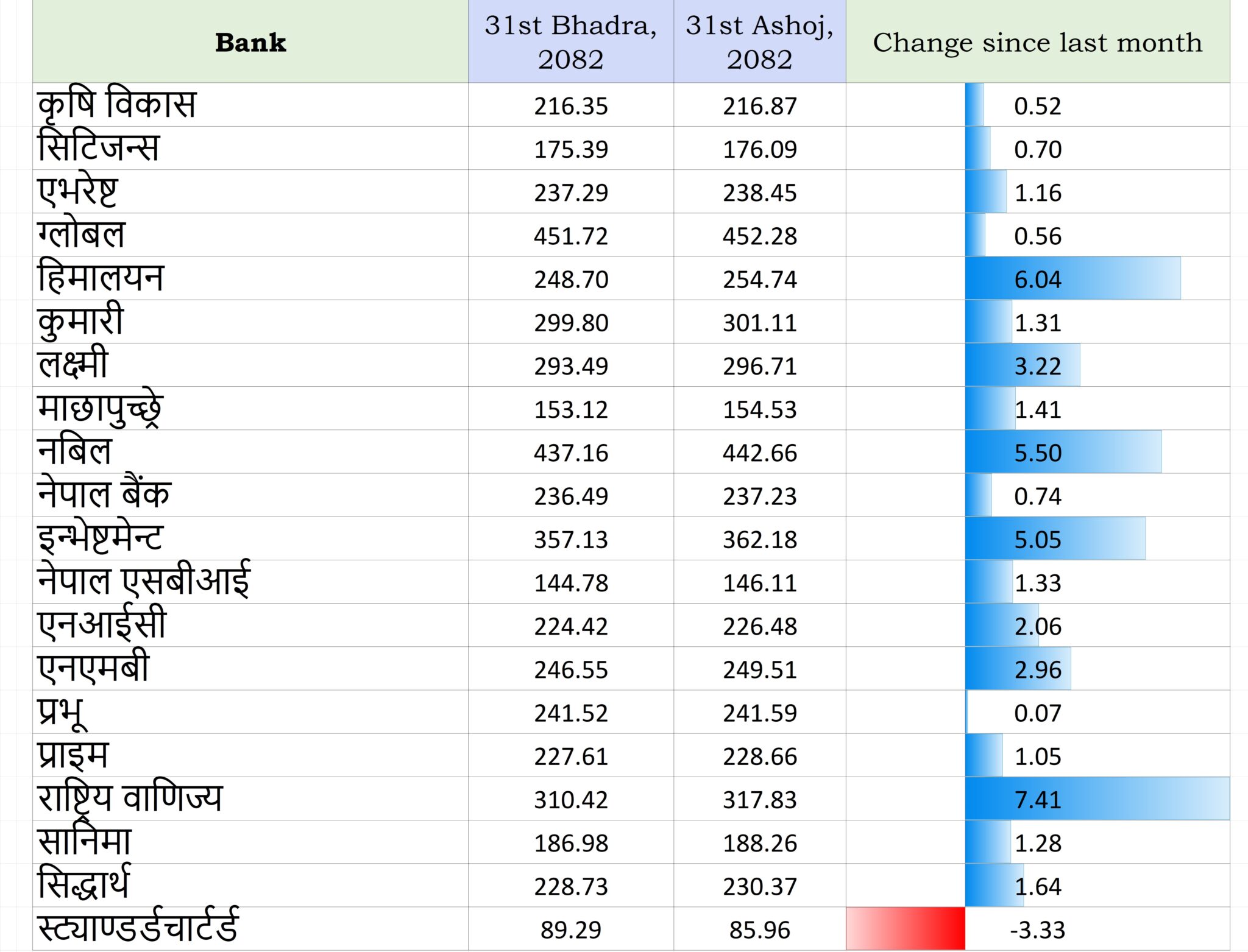 • कर्जा घटाउने बैंक: स्ट्याण्डर्ड चार्टर्ड बैंकले भने पछिल्लो एक महिनामा ३ प्रतिशतभन्दा बढीले कर्जा घटाएको छ।