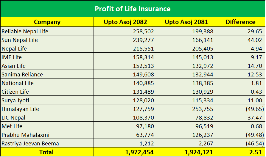 अन्य नाफा बढाउने कम्पनीहरू: एशियन लाइफ, सानिमा रिलायन्स (दुवैको १४.७०%), सूर्यज्योति लाइफ (११%), आइएमई (९.१७%), र नेशनल लाइफ (१.८१%)।