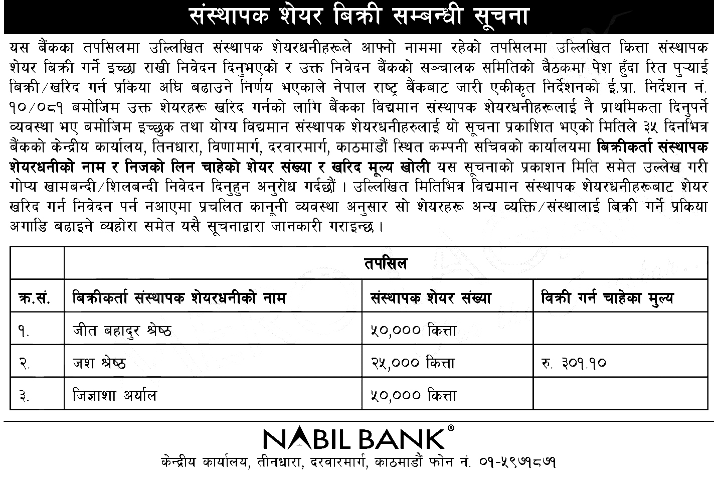 नबिल बैंकले बिक्रीमा राखेको कुल १ लाख २५ हजार कित्ता संस्थापक शेयरको विवरण निम्नानुसार छ: