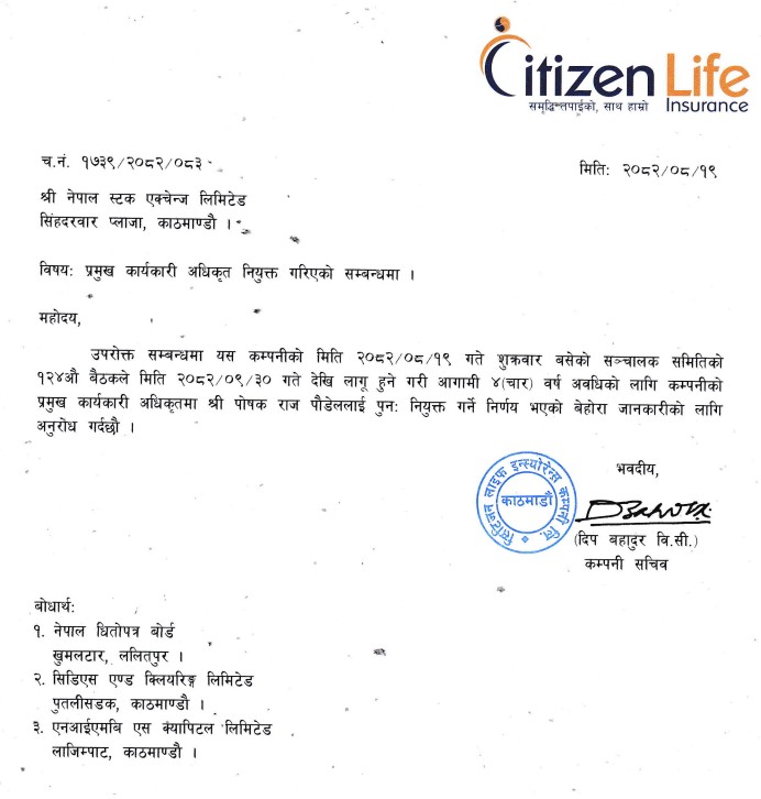 सिटिजन लाइफ इन्स्योरेन्स कम्पनीले सिइओ पोषकराज पौडेलको कार्यकाल थप गर्ने निर्णय गरेको छ। कम्पनीको गत शुक्रबार बसेको सञ्चालक समितिको बैठकले पौडेललाई पुस ३० गतेदेखि आगामी ४ वर्षका लागि पुनः सिइओ पदमा निरन्तरता दिने प्रस्ताव पारित गरेको हो।