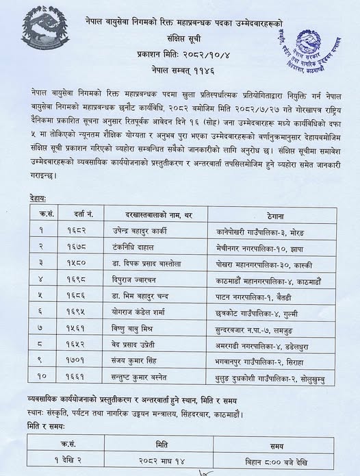 नेपाल वायुसेवा निगमको रिक्त महाप्रबन्धक पदका लागि छनोट प्रक्रिया अगाडि बढ्दै नयाँ चरणमा प्रवेश गरेको छ। संस्कृति, पर्यटन तथा नागरिक उड्डयन मन्त्रालयले आइतबार राति सूचना जारी गर्दै संक्षिप्त सूचीमा परेका उम्मेदवारहरूको नाम सार्वजनिक गरेको हो।