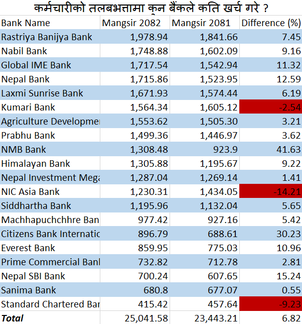 कुल २० वटा वाणिज्य बैंकहरूमध्ये १७ वटाले कर्मचारी खर्च बढाएका छन् भने ३ वटा बैंकमा भने यस्तो खर्च घटेको छ। तीन बैंक बाहेक अन्य बैंकहरूले अघिल्लो वर्षको तुलनामा अधिकतम ४१ प्रतिशतसम्म कर्मचारीको तलब तथा सुविधा वृद्धि गरेका छन्।